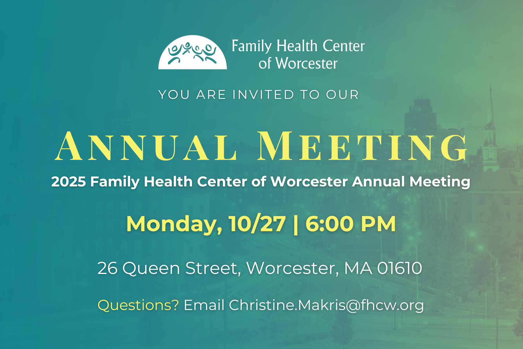 Family Health Center of Worcester will host its 2025 Annual Meeting on Monday, October 27th at 6:00 PM. This gathering will bring together leadership, staff, and community members to review the year’s achievements and set goals for the future.